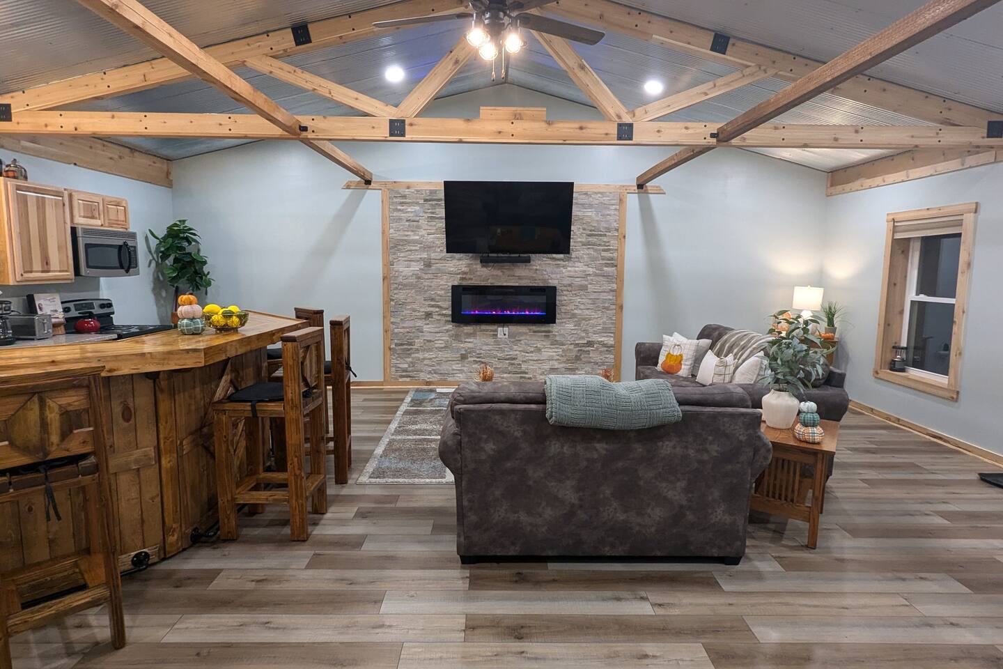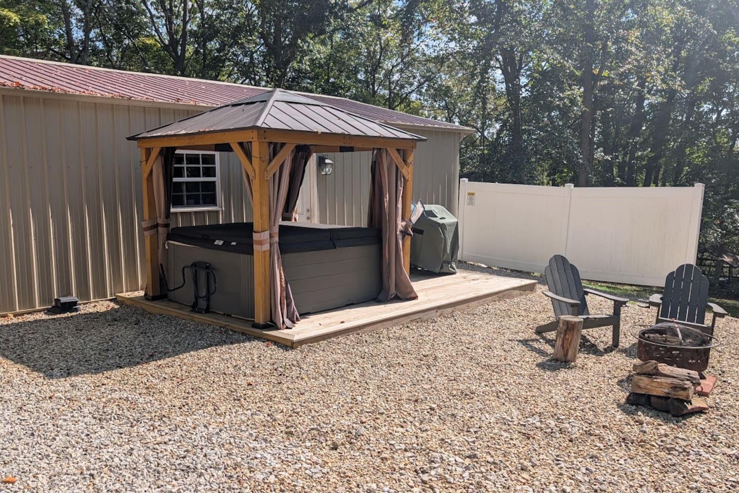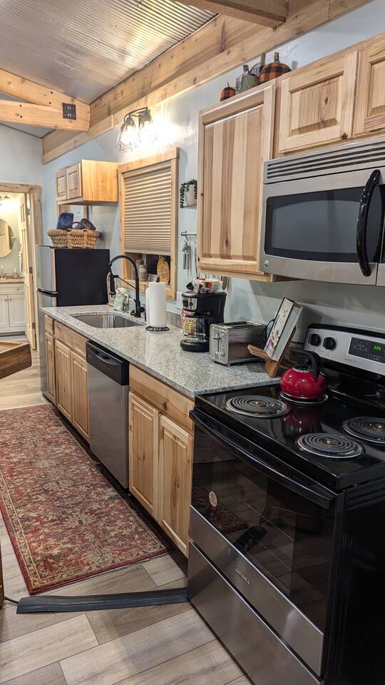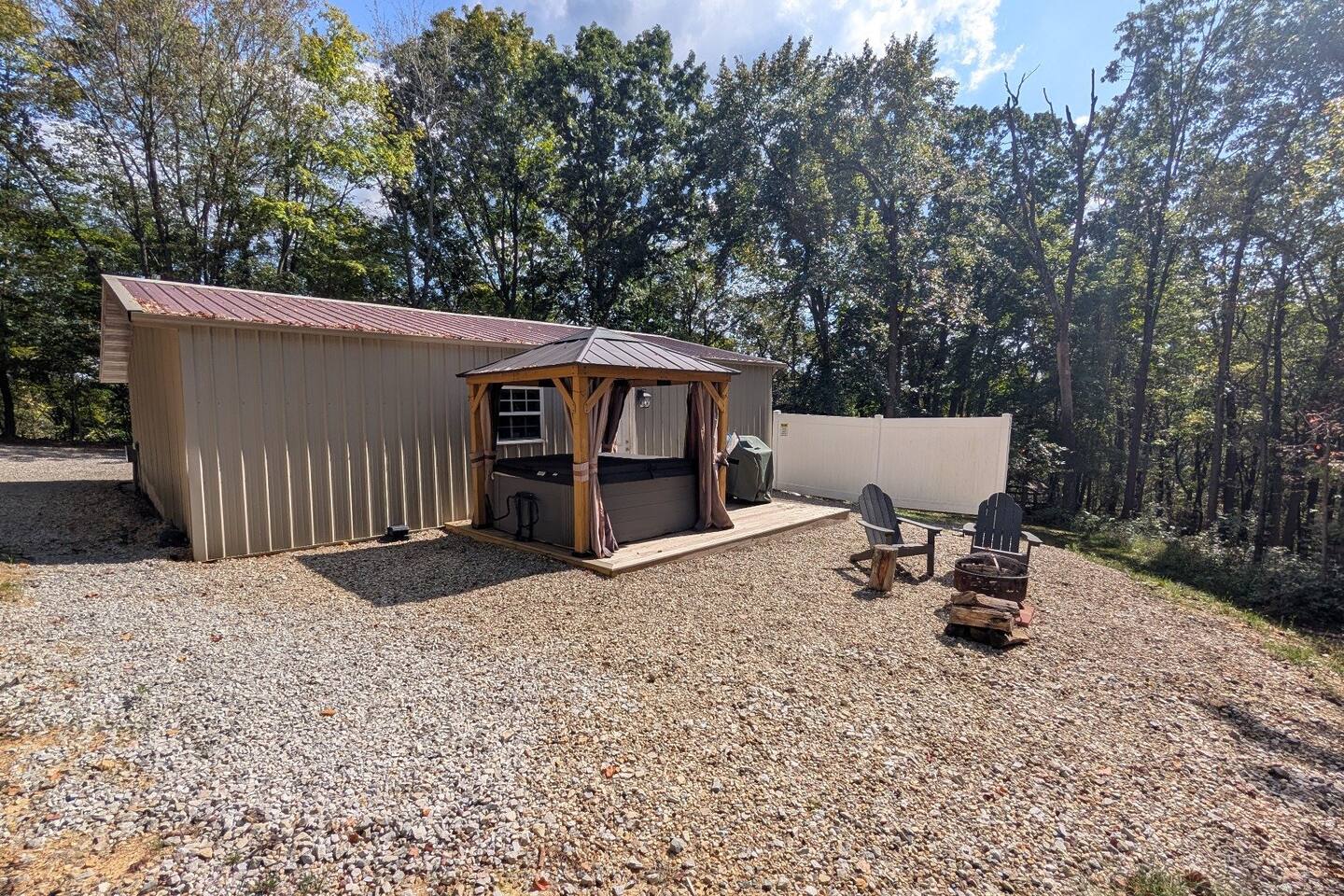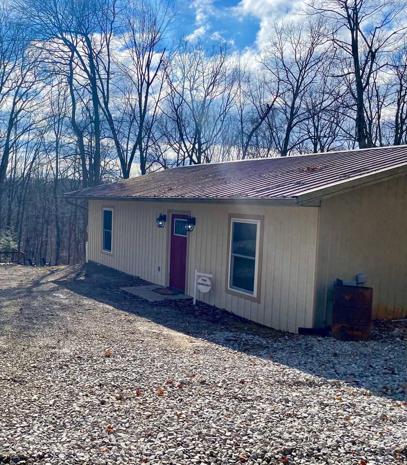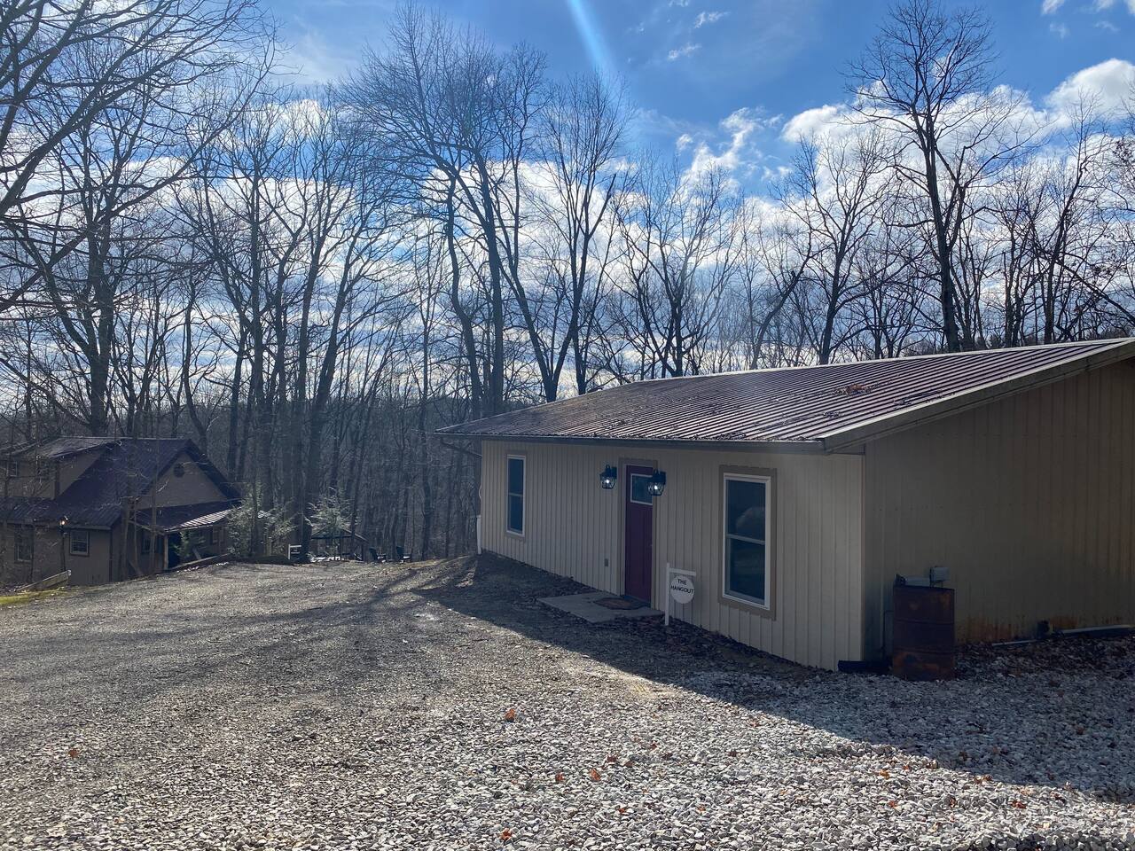 The Hangout is located on over 5 acres of wooded area, adjacent to our sister cabin The Hideout. Each cabin has its own amenities and parking areas and boasts plenty of privacy. The newly renovated cabin has a large open floor plan to entertain guests. The bedroom houses a luxurious king size bed and tv to enjoy a relaxing night in. There’s plenty of space if you’d like to bring an air mattress, or you’re welcome to get cozy on the couches. We don’t have an air mattress on-site, but feel free to bring one along if it helps make your stay more comfortable! The hot tub on the back deck is perfect after a big day of hiking. Located just 20 minutes from the Old Man's Cave Visitor Center at Hocking Hills State Park!