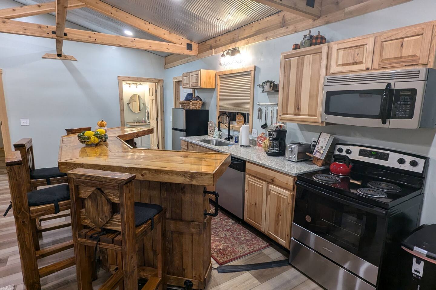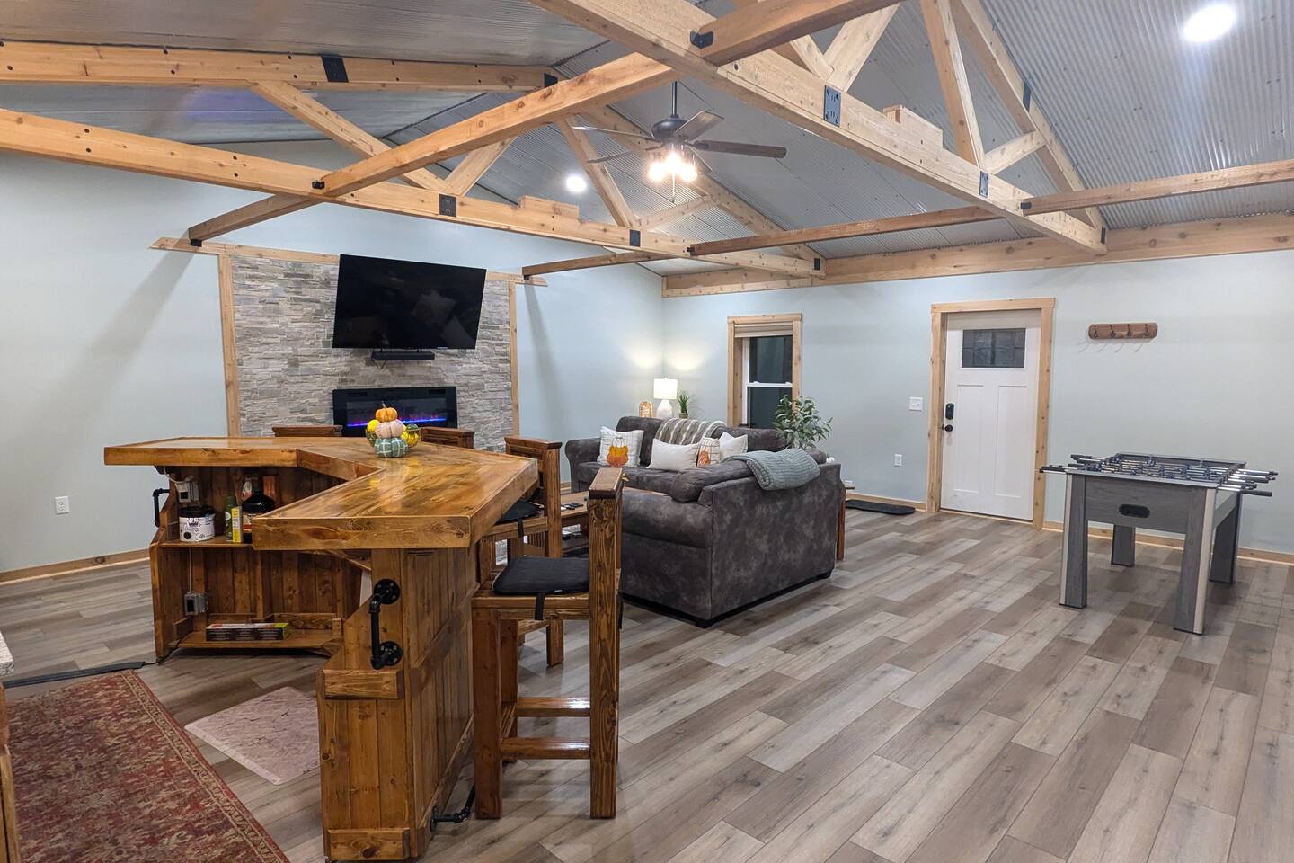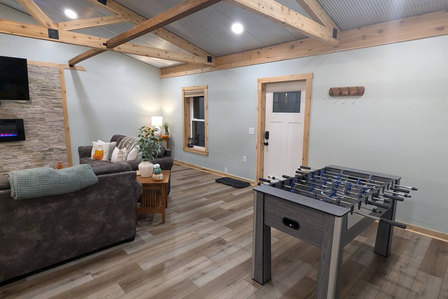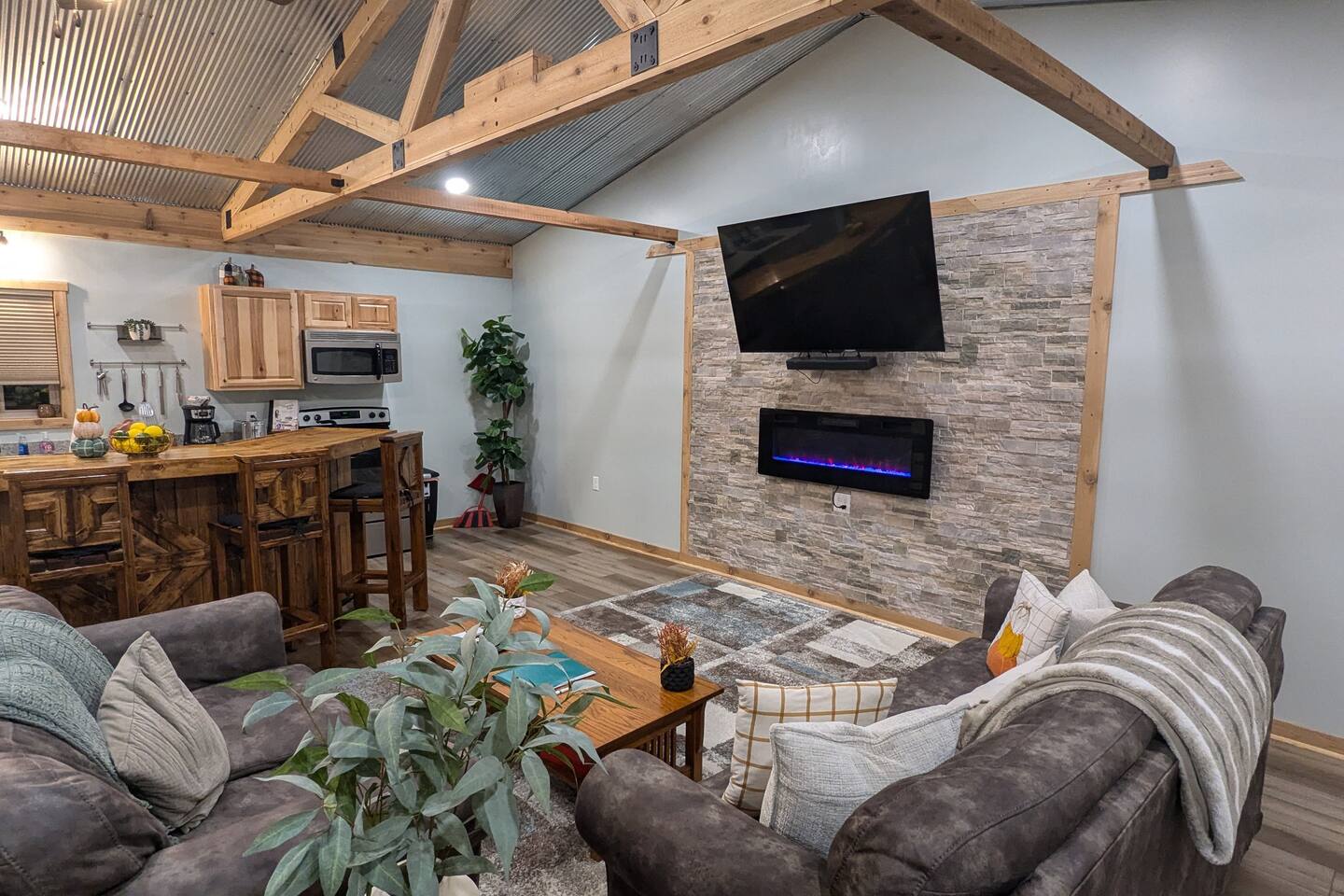 The Hangout is located on over 5 acres of wooded area, adjacent to our sister cabin The Hideout. Each cabin has its own amenities and parking areas and boasts plenty of privacy. The newly renovated cabin has a large open floor plan to entertain guests. The bedroom houses a luxurious king size bed and tv to enjoy a relaxing night in. There’s plenty of space if you’d like to bring an air mattress, or you’re welcome to get cozy on the couches. We don’t have an air mattress on-site, but feel free to bring one along if it helps make your stay more comfortable! The hot tub on the back deck is perfect after a big day of hiking. Located just 20 minutes from the Old Man's Cave Visitor Center at Hocking Hills State Park!