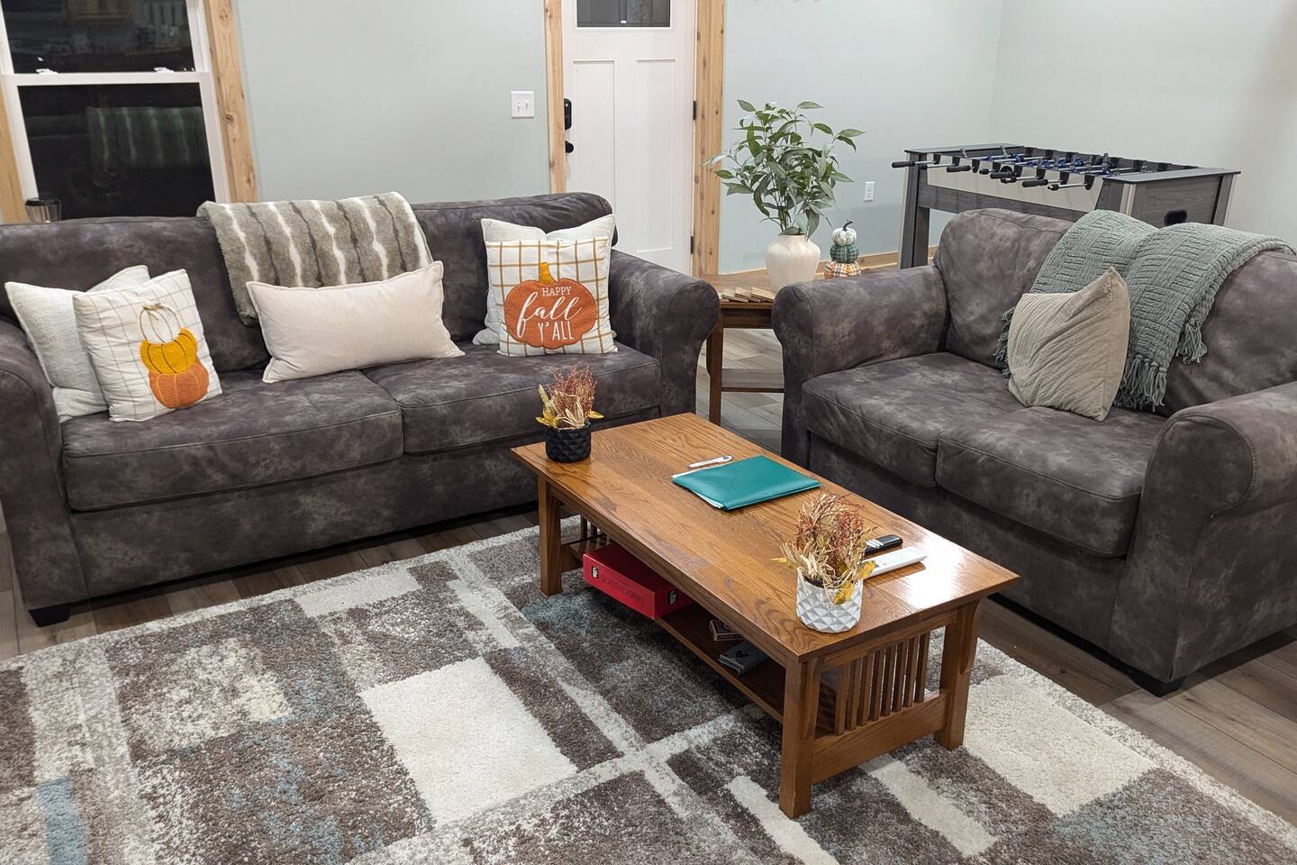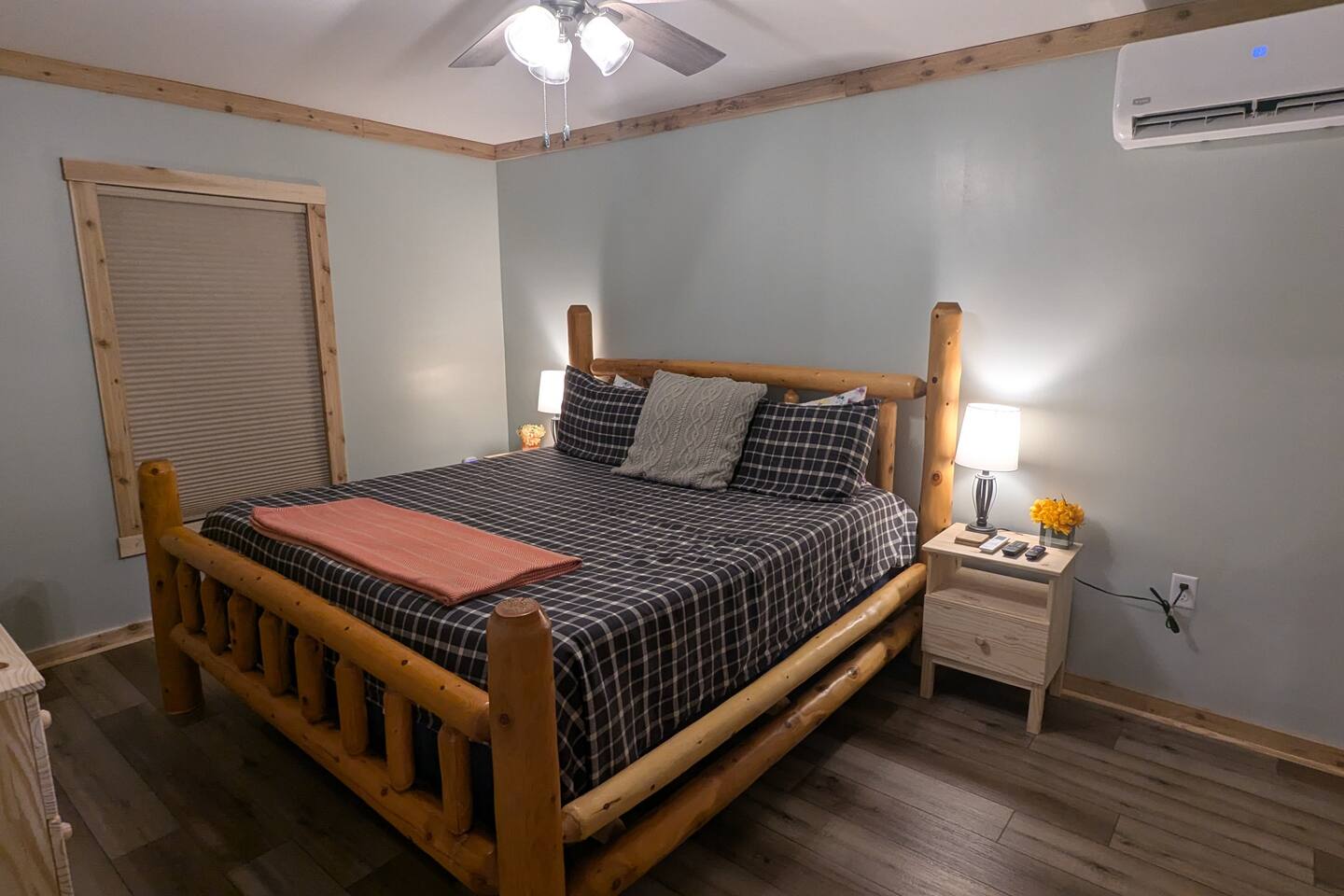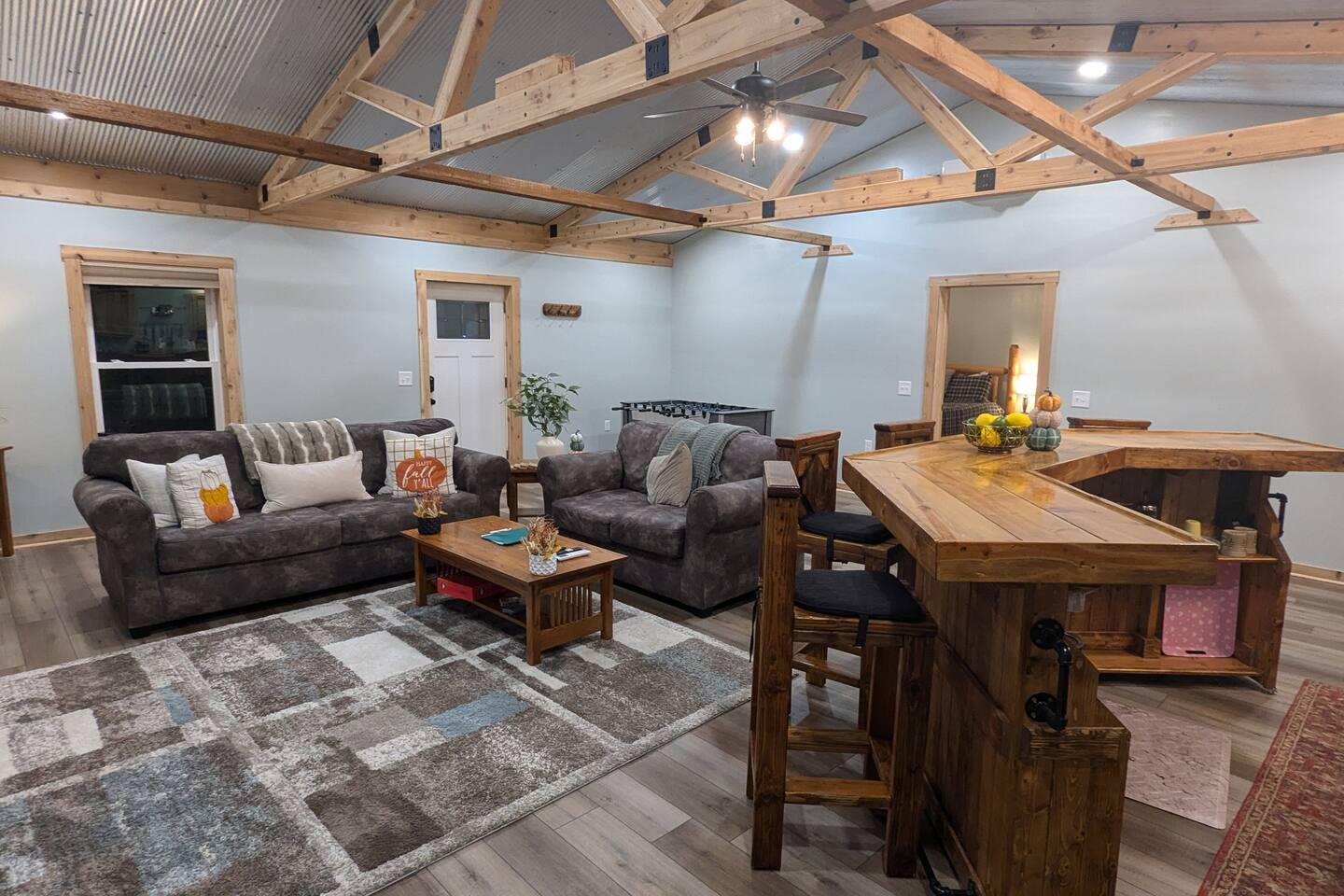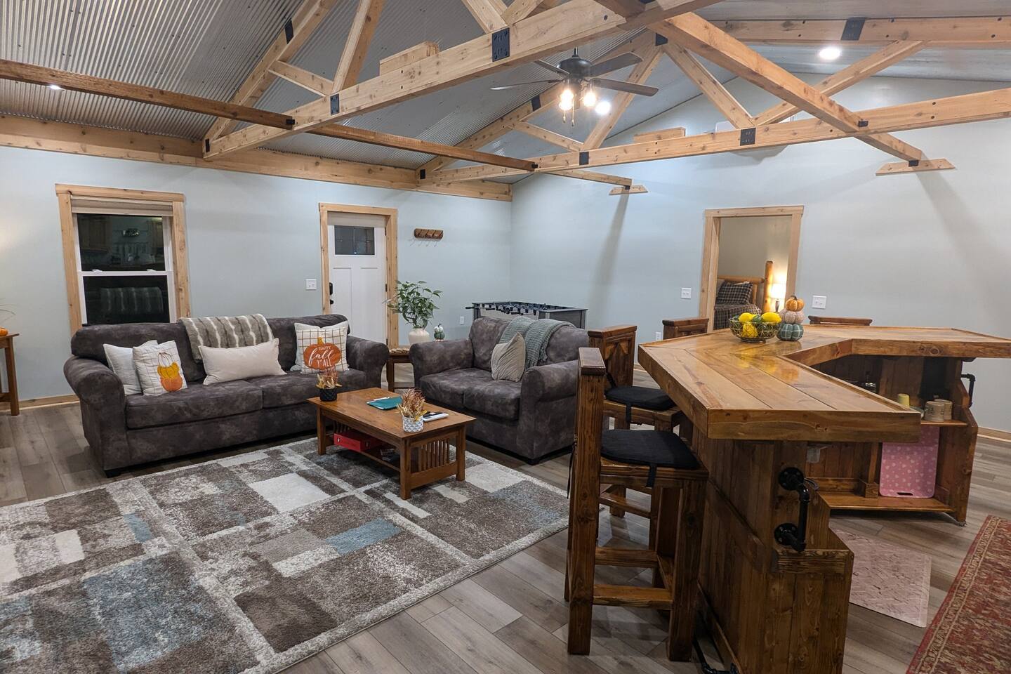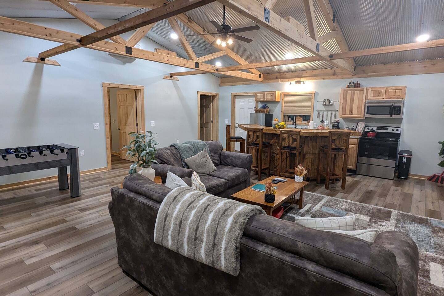 The Hangout is located on over 5 acres of wooded area, adjacent to our sister cabin The Hideout. Each cabin has its own amenities and parking areas and boasts plenty of privacy. The newly renovated cabin has a large open floor plan to entertain guests. The bedroom houses a luxurious king size bed and tv to enjoy a relaxing night in. There’s plenty of space if you’d like to bring an air mattress, or you’re welcome to get cozy on the couches. We don’t have an air mattress on-site, but feel free to bring one along if it helps make your stay more comfortable! The hot tub on the back deck is perfect after a big day of hiking. Located just 20 minutes from the Old Man's Cave Visitor Center at Hocking Hills State Park!