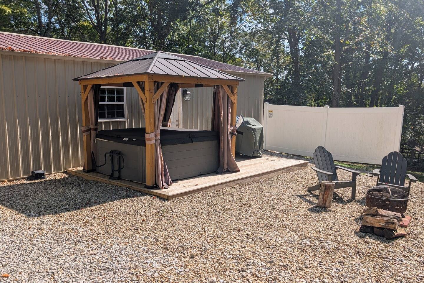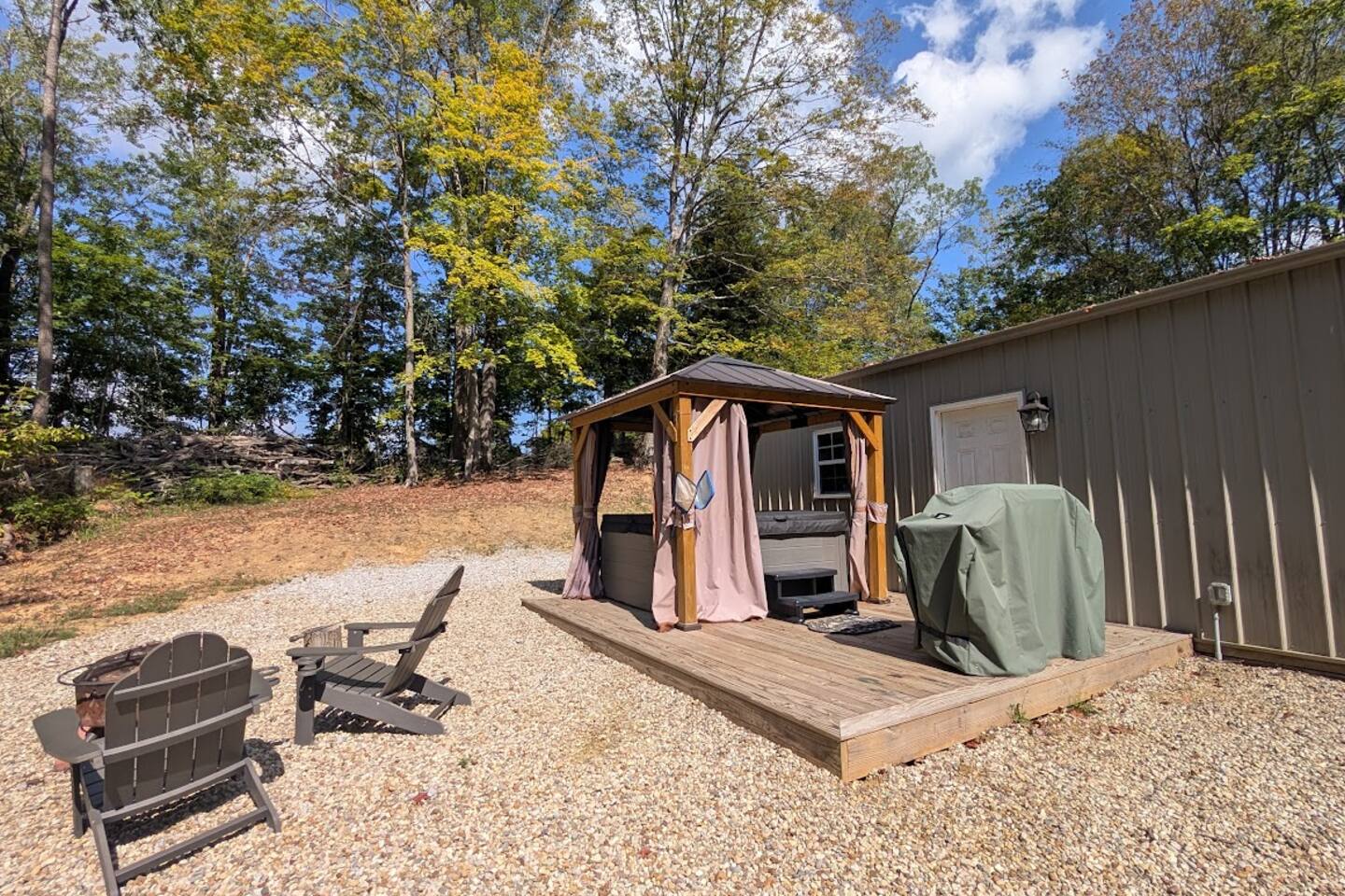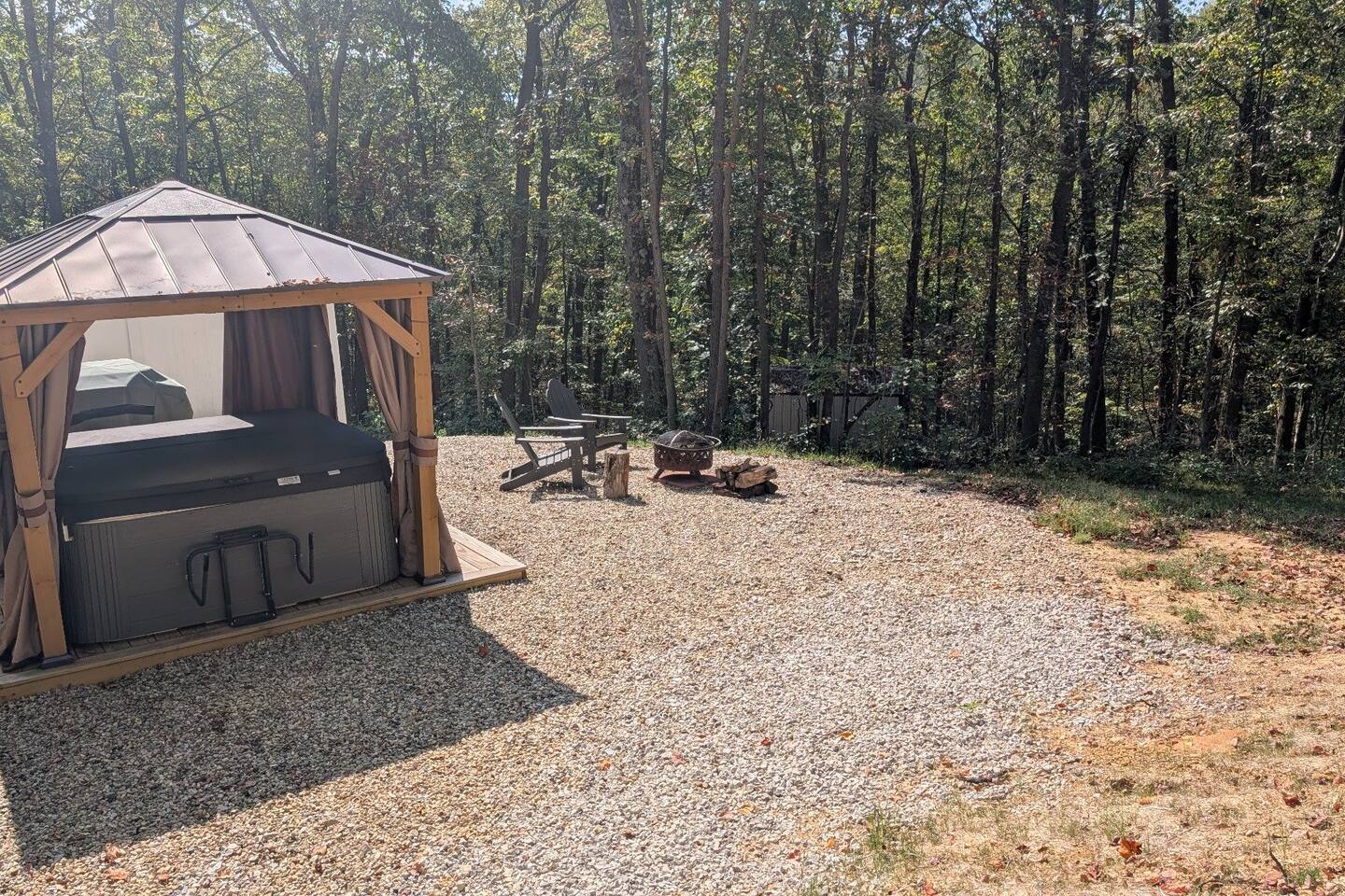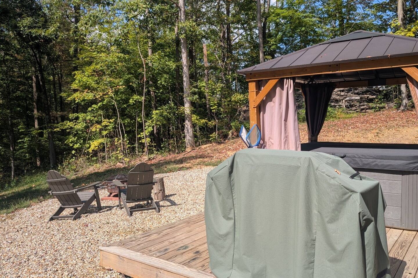 The entire cabin and back deck with hot tub is for your use. Feel free to roam the grounds but be aware that the other cabin's outdoor fire pit and hot tub are for their use only. The driveway and grounds are shared with the Hideout guests, but separate amenities for each cabin are included.